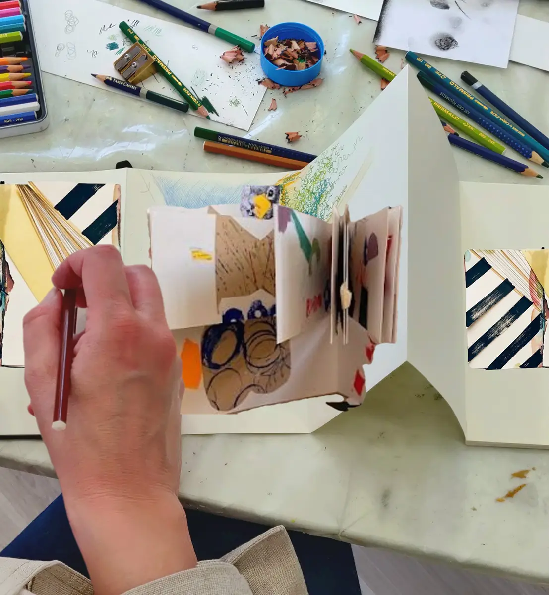 Explorateurs du monde artistique, vous développerez votre propre expression graphique et plastique pour partager, laisser aller votre imagination, et transcrire l’essentiel au fil de votre carnet accordéon.